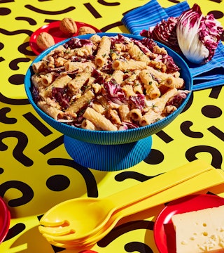 Revisitez le classique plat de pâtes avec cette recette, mêlant le croquant du radicchio et la gourmandise d’un pesto onctueux de haricots blancs et de fromage.