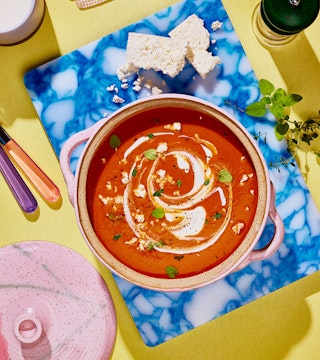 Recette de soupe crémeuse de tomates et poivrons rôtis, rehaussée de feta et basilic. Cuisson à la plaque et ensuite passés au mélangeur pour obtenir une soupe goûteuse et onctueuse. Un plat réconfortant!