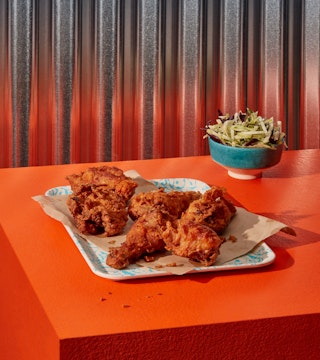 Accompagnements suggérés : miel épicé (pour tremper le poulet) et salade de chou.