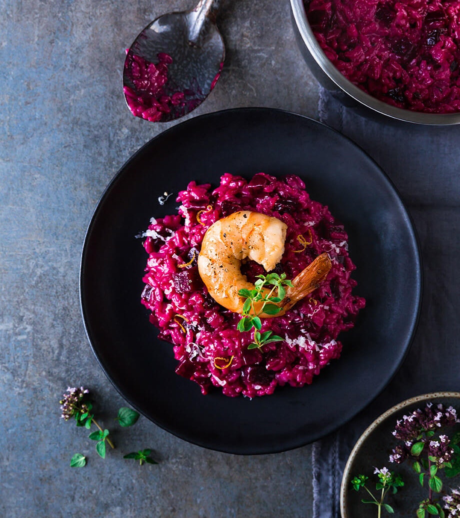 Risotto à la betterave et crevettes géantes