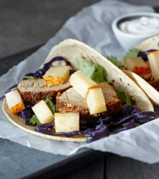 Tacos au filet de porc, chou rouge et fromage