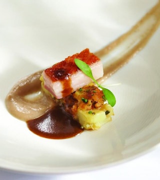 Tartiflette de pommes de terre rattes aux lardons et au Victor et Berthold, flanc de porc braisé au cidre de pomme Chemin du Minot, purée de panais au sucre à la crème