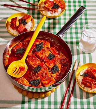 Cubes de tofu braisés dans une sauce épicée au gochujang et au beurre.