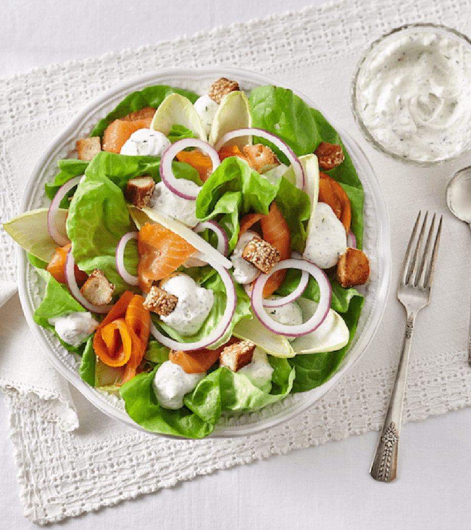 Salade de laitue et saumon fumé, vinaigrette fouettée à l’aneth et au citron