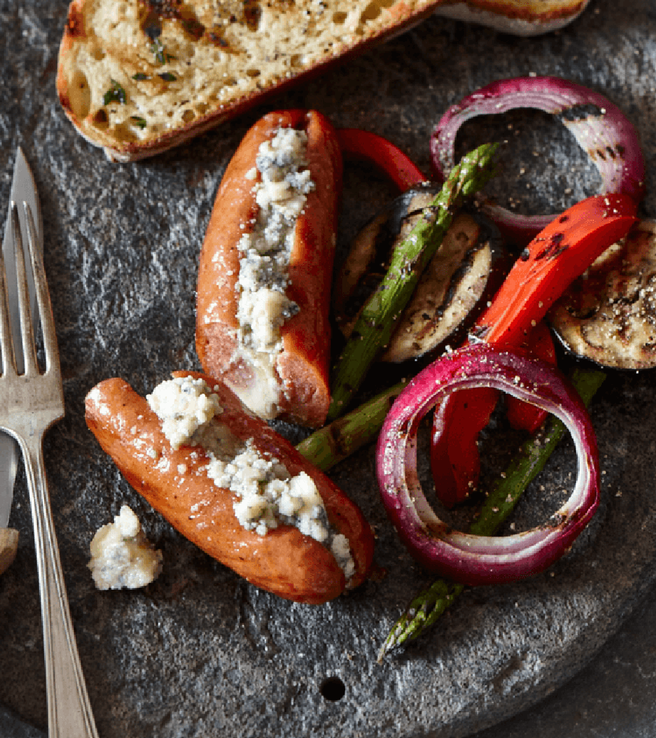 Saucisses grillées farcies au fromage sur salade de légumes grillés
