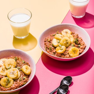 Gruau chocolaté aux grains à la mijoteuse, garniture de bananes au beurre