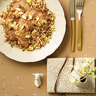 Escalopes de veau rapido, sauce cari, raisins secs et amandes
