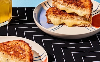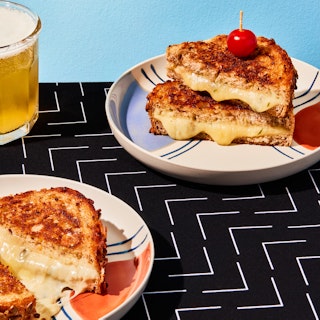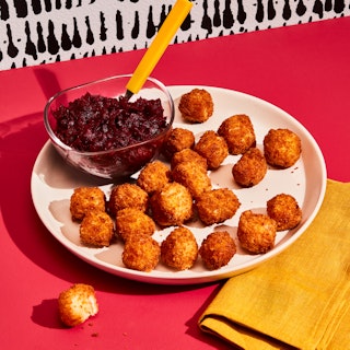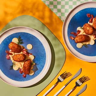 Croquettes de fromage, purée d'oignons caramélisés, bacon et pomme